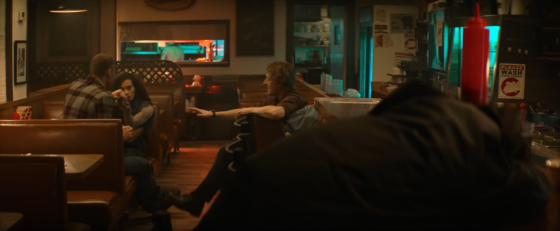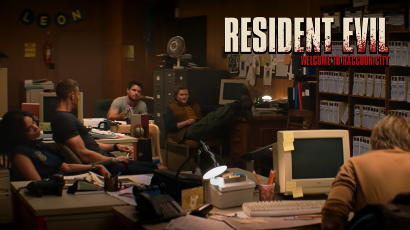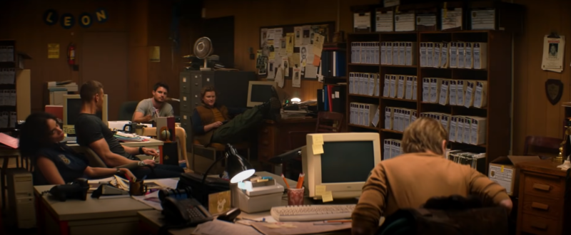 We get a couple of shots of Chris aboard S.T.A.R.S. Alpha team’s helicopter, and then a first look at their office. This location oozes 90s nostalgia with big chunky beige cream-colored monitors and even what looks like a fancy Rolodex on Richard’s desk. In the games, we’ve never gotten to see S.T.A.R.S. outside of the individual horror stories of the games, which is something a lot of fans have been begging to see, and this looks to be our very first chance. Interestingly, in the upper left corner, we can see Resident Evil 2‘s “Welcome Leon” sign (and, thanks to set photos, we know it also has the missing second L gag from REmake 2 – and we can also see Wesker’s ’96 aviators). Leon most certainly isn’t S.T.A.R.S. in this film, so it’s possible they simply share a larger bullpen-style workspace with other R.P.D. officers, rather than having their own dedicated space. We see larger shots of this room in Jill’s trailer, which seems to indicate that it’s at least bigger than this one shot.