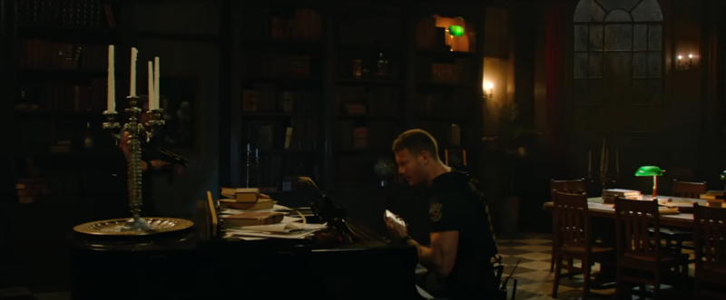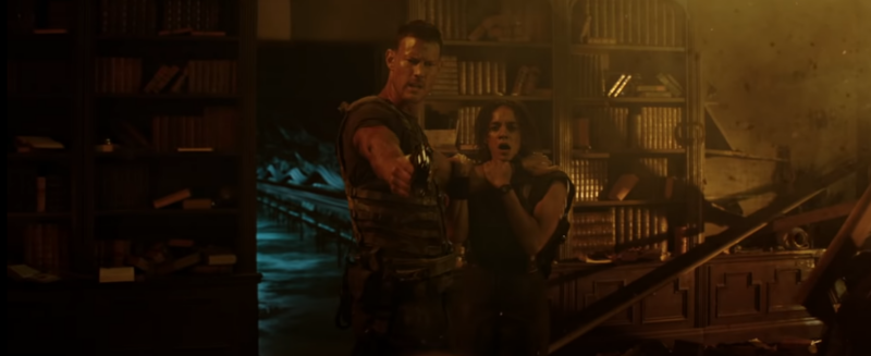 Following this, we see that same library room in ruins, thanks to Brad crashing his helicopter through the window. It seems like the timeline of events might be: Wesker figures out the puzzle, Brad crashes through the window, Wesker and Jill return to the wreckage to go explore the new area opened up by the piano. We then see Wesker slowly draw a gun as Jill looks positively shocked and a little mortified, which might indicate her trust in Wesker is failing after he opened the secret door (which also matches up with a shot of her holding the P.D.A. while looking on in horror from the original trailer), before Wesker (later in the trailer) is shown to have aced a zombie that was behind her (which might be an R.P.D. officer, they have a patch on their sleeve).