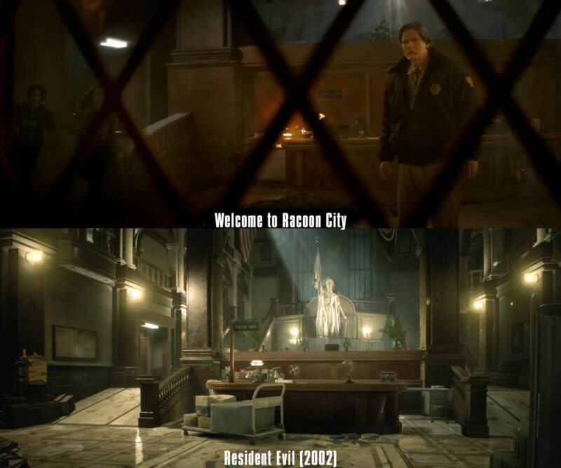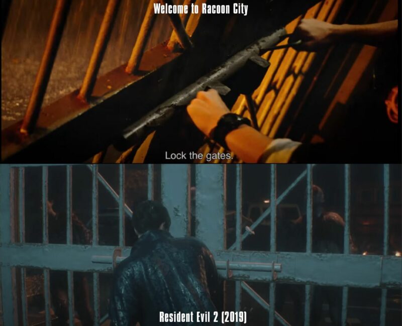 We get to see a shot of Chief Irons barking orders at Leon, followed by our boy in blue sliding the main gate bolt across like in REmake 2.