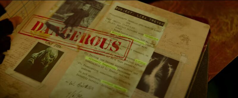This is another spot where the two trailers split off, with the EU trailer showing William Birkin (who, unlike his game counterpart, seems to actually love his daughter) bursting into Sherry’s bedroom and urging her to come with him. The US trailer instead drops us in on Claire and Chris as she attempts to preach the good gospel of “fuck Umbrella”. Claire pops on a VHS tape sent to her by the one and only Ben Betroluci, who’s been recharacterized as a conspiracy theorist who’s been helping Claire collect evidence to bring the company down. I tried to see if there was anything on his Pepe Silvia board, but nothing in particular stands out.