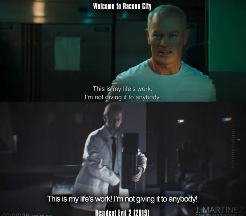 A major change to the scene, however, is that Birkin appears to be monitoring them here. In the games, Alexia and her brother Alfred were part of an experiment that saw them cloned from the genetic model of Umbrella co-founder Alexander Ashford’s ancestor, Veronica. Showing them actually being monitored as part of this footage is a creepy touch that ads to the weird combination of tragedy and horror that surrounds these two deeply disturbed siblings.