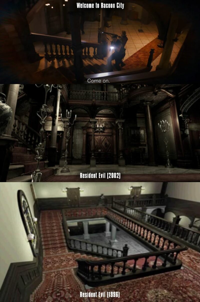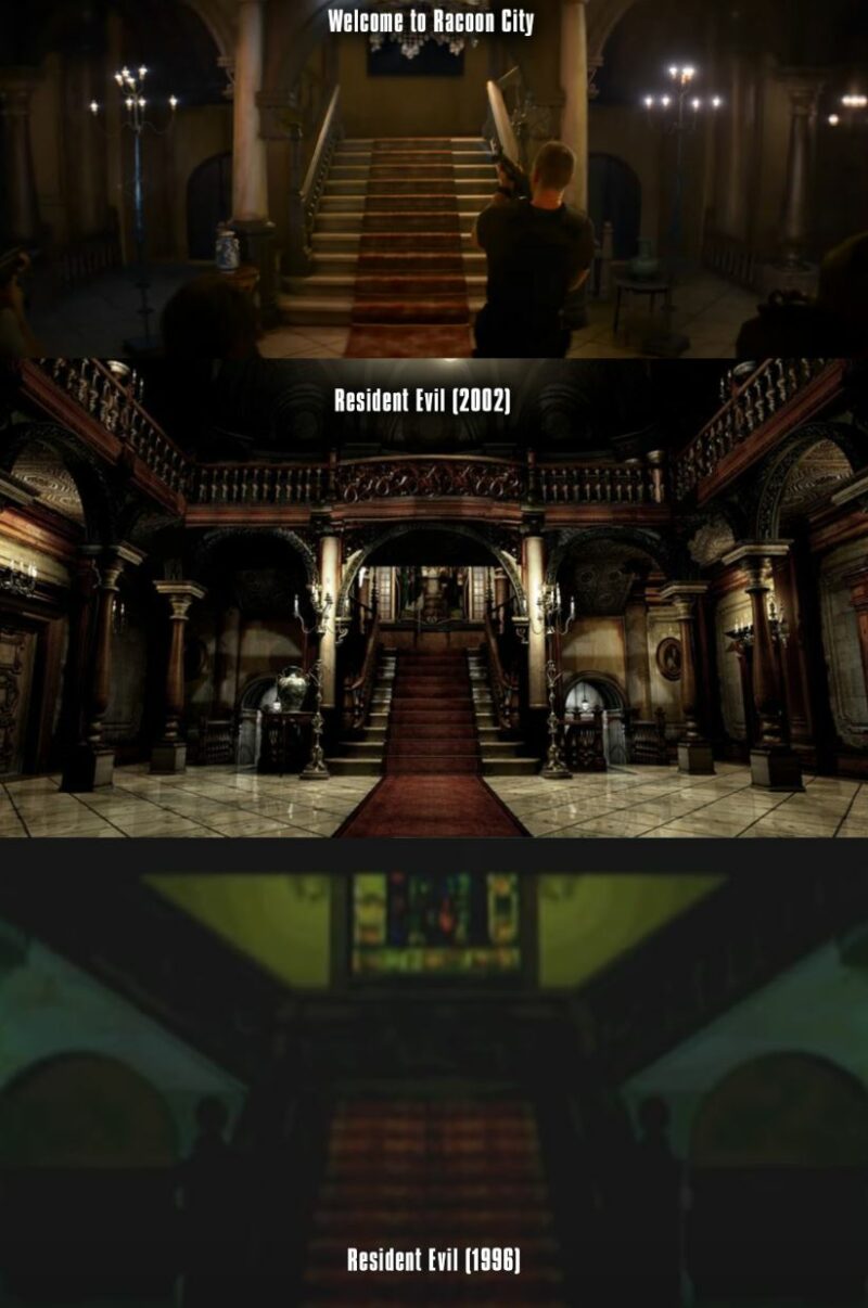 Now in the US trailer, we have what was, for me, the money shot. One of the things I’ve been very anxious to see is the interior of the Spencer mansion, which is perhaps the franchise’s most iconic location. The build-up in the trailer showing the floor and then Chris and Jill reacting to it in awe before finally showing it was… overwhelming. Alright, I gotta focus here, so we have our first look at the Spencer mansion main hall, which has been recreated from a combination of both its 1996 and REmake versions. The REmake inspiration is the strongest here, but elements like the backdoor being swapped out for a stained-glass window match up with the original.