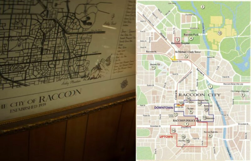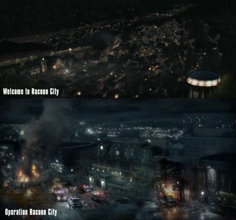 Next we get a wide shot of Raccoon City itself. Unlike the remakes (where the city is portrayed as a small metropolis), Raccoon has been scaled back to something closer to its original game origins — a small town surrounded by forested mountains, with residential and business sections and only a few tall buildings. The R.P.D. can also be seen, which is using the REmake 2 design to a T. Interestingly, this angle is vaguely reminiscent of a piece of Operation Raccoon City concept artwork.
