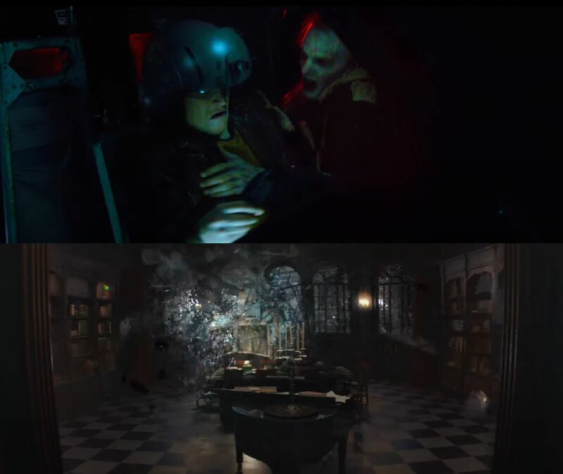 At last, the two trailers synch up again, with a beautiful establishing shot of the Spencer estate. The Spencer Estate, despite being one of the franchise’s most iconic locations, doesn’t actually have many images of what it looks like from the outside, at least not dead-on like this. There’s a piece of concept art, but it contradicts the interior in a few ways. It appears the film has married both that concept art with the correct windows as shown from the building’s interior, which is a nice way of blending it all together.