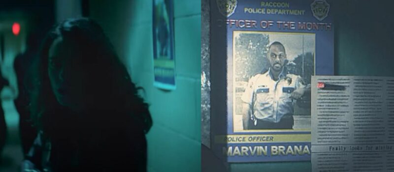Next we have Claire and her posse of survivors moving down a hallway in the R.P.D., and if I’m not mistaken there’s a quick shout out to beloved officer Marvin Branagh. In REmake 2, you can find “officer of the month” posters celebrating Marvin throughout the R.P.D.. Low and behold, based on the color and design, that same poster appears to have been recreated for this film as a small background reference.