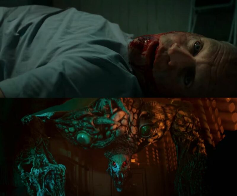Back to back we have shots of Birkin ‘waking up’ after his execution at the hands of the U.S.S., and then his final mutated form as G, ripping his way into what might be the final escape train from the end of Resident Evil 2. This look isn’t based on any specific version of G, with Stage 3 being perhaps the closest but still not exact. Odds are this is his only real mutation in the film (maaaaybe we’ll see G1) and they wanted to pack a wallop on the nightmare scale.
