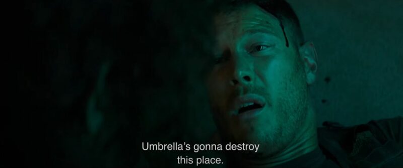 Here we see what appears to be Wesker’s death, or at least him faking it. It’s hard to tell where exactly this film is going with him — but my bet is that he stays a “hero” for the duration, and is only revealed as a traitor after being “reborn”, and will come back as Wesker™ in the sequel, as he’s one of the main antagonists of Code: Veronica.