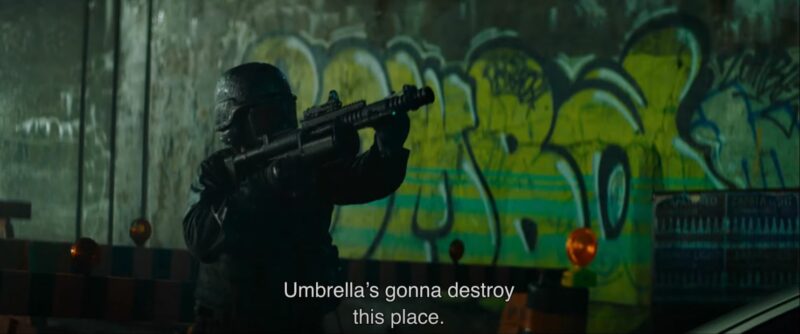 We have some shots of the U.S.S. opening fire in the streets of Raccoon, which either means that they’re acting as the U.B.C.S. in this story, or more sinisterly — operating as a cleanup crew and taking out everyone systematically. It remains to be seen if Raccoon will get nuked at the end of the film, so it’s possible that Umbrella makes an effort to contain the outbreak first. This sort of cleanup operation is common in zombie media, and it makes what Umbrella did to Raccoon feel a little bit more personal than just getting the US government to push a button. It’s also entirely possible that this doesn’t work, and they drop the bomb anyway.