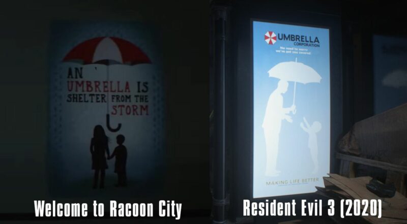 Next, there’s some shots of the inside of Raccoon City orphanage, with William Birkin up to no good. On the wall we can see what looks like a cutesy, hand-done Umbrella poster, which is vaguely reminiscent of an ad seen in REmake 3.