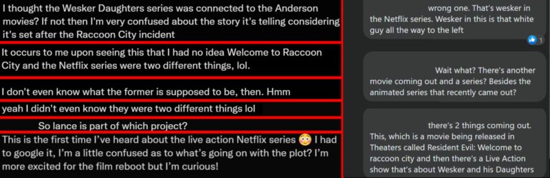 On top of all of this, the concurrent announcement for Welcome to Raccoon City and Netflix’s upcoming Resident Evil series has left many confused as to which project is which, or that they’re separate entities at all. In Rely on Horror’s comments (as well as responses to my own tweets) I’m constantly seeing fans confused, assuming the two projects are one and the same, that one existed while the other was a rumor or that the Netflix Resident Evil that people were referring to was Infinite Darkness, which released earlier this year — which is completely separate from either of these two things. Even googling the cast list for the Netflix show led to a confusing mash-up of articles about both projects.