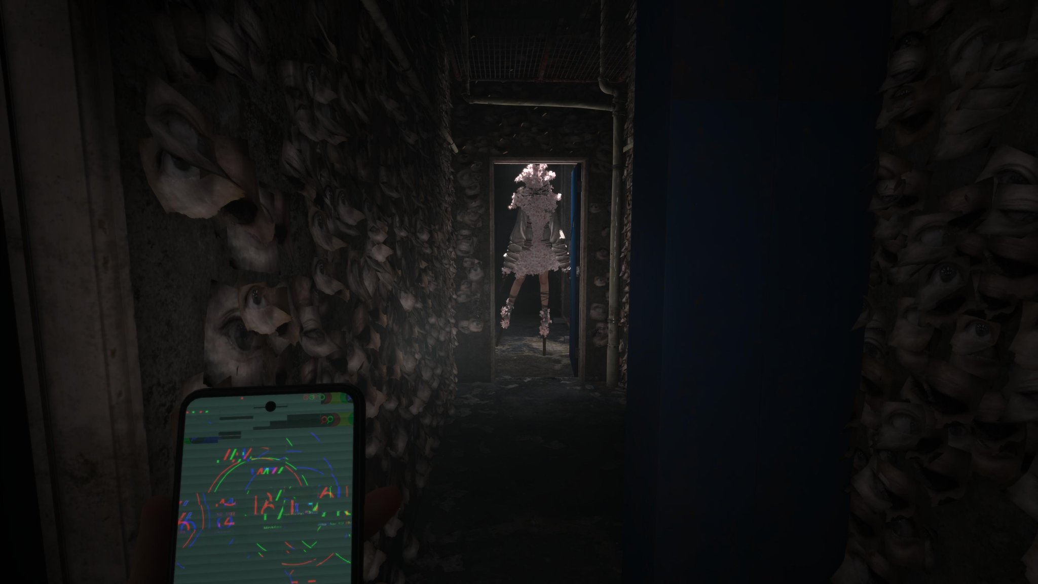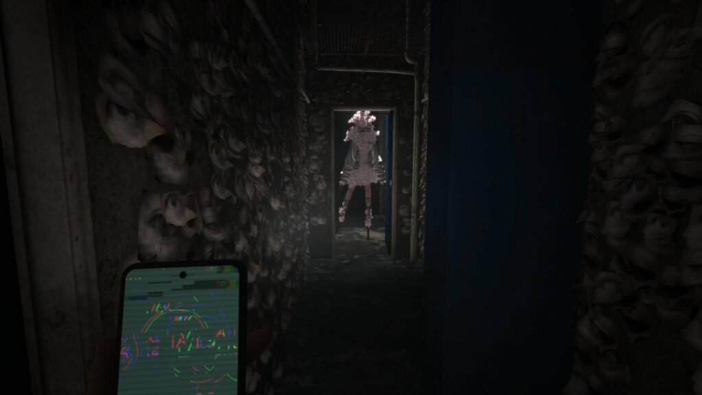 Encounters with the cherry blossom monster are tense and frantic. The chase sequences with the monster are preceded by the game screen and Anita’s phone glitching out, foreshadowing the panic-inducing ordeal. These intense, fast-paced sequences punctuate the slower, exploratory sections. This dynamic creates a rhythm for players that alternates between calm and safe areas to tense and frantic ones, similar to the effect of the shifts from the normal world to the otherworld in the previous games.