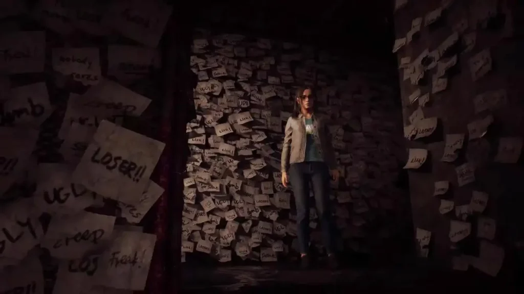 Anita’s trauma manifests around her as verbal abuse from her mother, bullying from her schoolmates, and endless amounts of Post-it notes with taunts like “loser”, “crybaby”, and “I HATE you,” scribbled on them. The primary manifestation of her trauma is represented as a gaunt figure with pink cherry blossoms emanating from its extremities which hunts you down throughout the game.