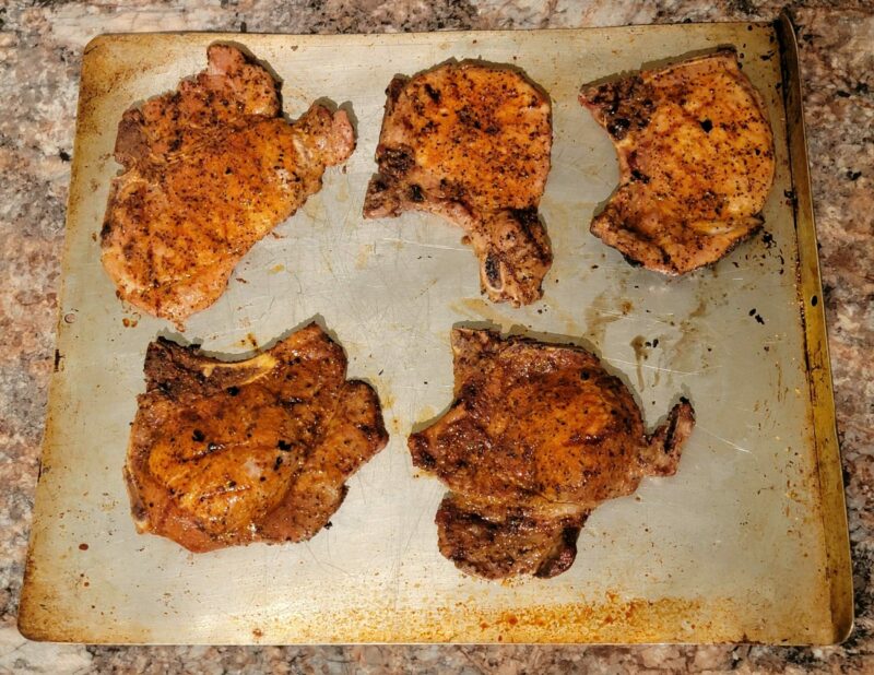 I generously applied the rub to ensure complete coverage of the pork chops. They were cooked on a propane grill at 400°F for 5 minutes on each side. They came out juicy and had a bold, tangy, smoky flavor. This one was easily my favorite of the three rubs.