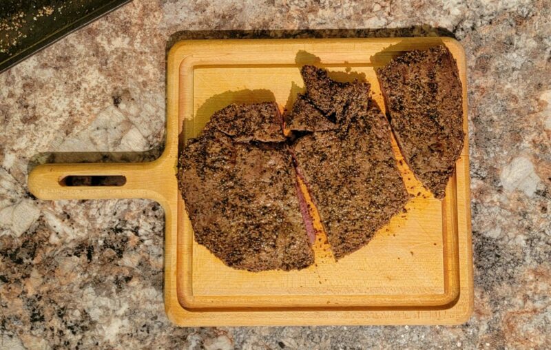 I was pretty liberal with my application of the rub here since I enjoy a bolder flavor. The steak was cooked on a propane grill at 400°F, 5 minutes on each side, and came out medium rare. Black pepper and cayenne pepper defined its extraordinary, robust taste.